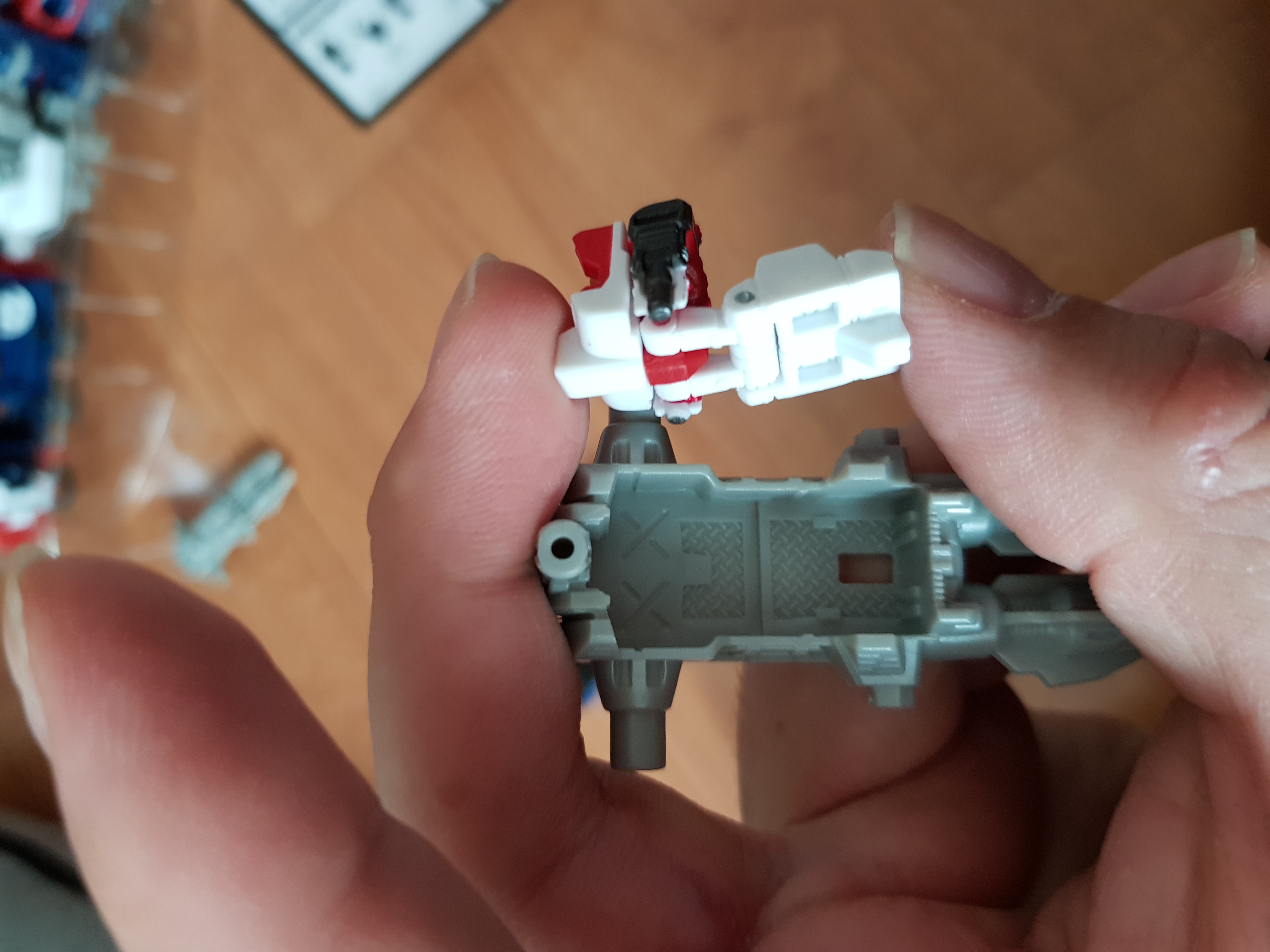 갓봄버의 허벅지부분을 꺾어서 빨간부품 옆에 넣으면 딱 맞는다. 신기하게 고정이 되서 살짝 신기.